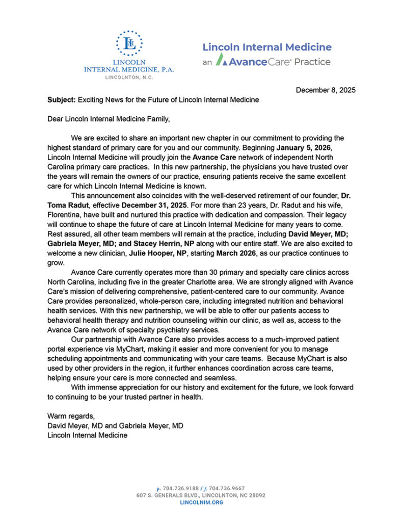 Geriatrics), and David Meyer, MD. Lincoln Internal Medicine may be reached at 704-736-9188.
